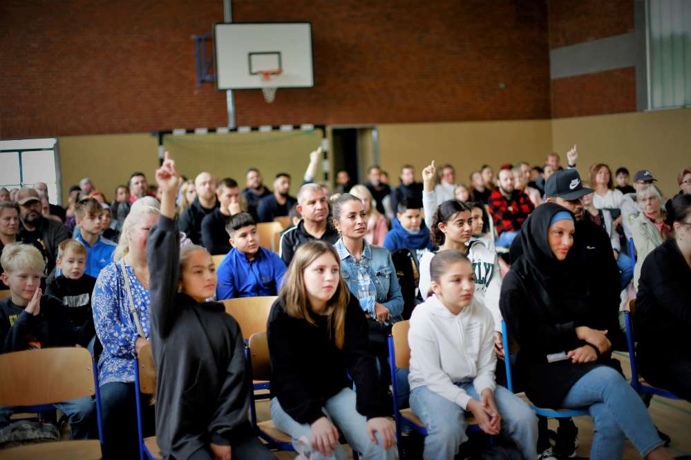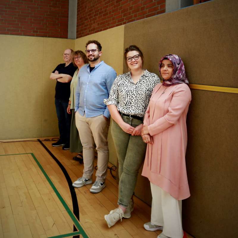 Mit der Schulleiterin Frau Froch nahmen die Klassenleitungen, Frau Brüssow mit Herrn Blankenau (Klasse 5a) , Herr John (Klasse 5b) und Frau DeVries mit Frau Yaman die neuen Schüler:innen der Klassen herzlich im Empfang.