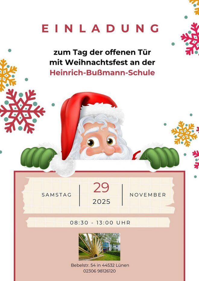 Wir laden Sie herzlich zu unserem Tag der offenen Tür ein, der am 29.11.2025 in Form einer Weihnachtsfeier stattfindet. Die Feier beginnt um 8:30 Uhr. Die Kinder können sich frei an den verschiedenen Stationen bewegen, während sich die Eltern und Erziehungsberechtigten bei Kaffee und Kuchen die Zeit vertreiben können.